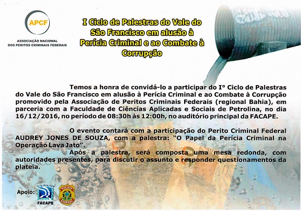 A Faculdade de Ciência Sociais e Aplicadas de Petrolina (Facape) leva para o ambiente acadêmico uma discussão que vem tomando conta de todo o país: a corrupção. A Faculdade e a Polícia Federal (PF) são parceiras do I Ciclo de Palestras do Vale do São Francisco em alusão à Perícia Criminal e ao Combate à corrupção, evento promovido pela Associação Nacional dos Peritos Criminais (APCF) que acontece, gratuitamente, no dia 16 (sexta-feira) de 8h30 às 12h no Auditório da Faculdade.