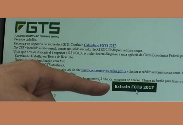 O e-mail encaminhado pelos criminosos vem intitulado de “EXTRATO FGTS 2017”. O fato da mensagem conter o valor exato do saldo, muitas pessoas têm caído no golpe. Ainda é possível visualizar quanto tem na conta, mas o banco não envia mensagens sobre o assunto.