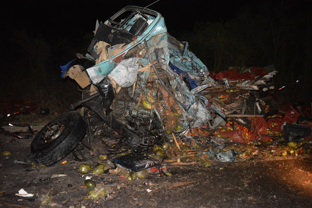 Segundo informações o acidente desta noite de terça-feira (28/02), último dia do mês de fevereiro, ocorreu no KM 113, trecho do distrito de Catuni da Estrada, de acordo com a Polícia Rodoviária Federal o sinistro ocorreu por volta 22h30, envolvendo dois caminhões que colidiram frontalmente, sendo um Ford Cargo, placas MLE-0958, licença de Anchieta-SC carregando com cocos que saiu de Juazeiro com destino a Salvador, no sentido oposto seguia uma Mercedes Benz 1114 placa JMB-4610, licença de Campo Formoso-BA que transportava tomates.