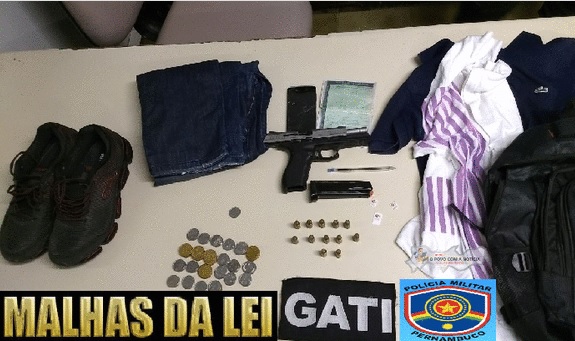 A arma de fogo, uma PT 840 Taurus n° SEU 04643, com um carregador e 12 munições intactas, pertencente ao sargento PMPE da  reserva, estava escondida no guarda roupa de sua residência, além da mochila e roupas utilizadas no crime, como também a quantia de R$ 152,00 (cento e cinquenta e dois reais) fruto do roubo, sendo que foi tomada de assalto a quantia de R$ 920,00 do mercado. Não sendo localizado a arma usada no crime, como também a moto usada no assalto.