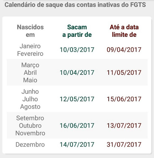 Nesta sexta-feira 10/03/2017, os trabalhadores que tem contas INATIVAS do FGTS, e nasceram no mês de janeiro e fevereiro, podem sacar o dinheiro. Essa é uma das medidas do governo Michel Temer para tentar reaquecer a debilitada economia brasileira.