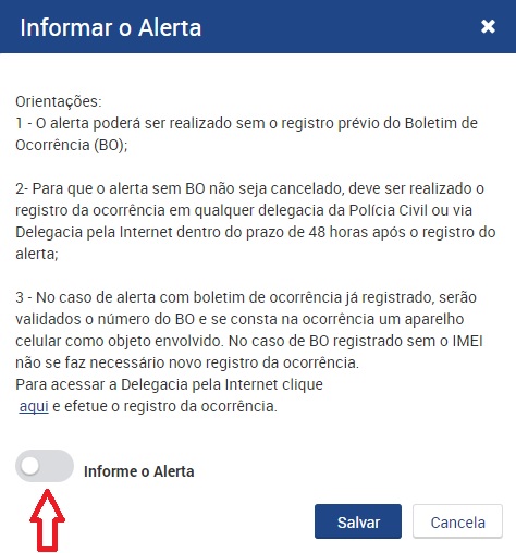 2- Para que o alerta sem BO não seja cancelado, deve ser realizado o registro da ocorrência em qualquer delegacia da Polícia Civil ou via Delegacia pela Internet dentro do prazo de 48 horas após o registro do alerta;
