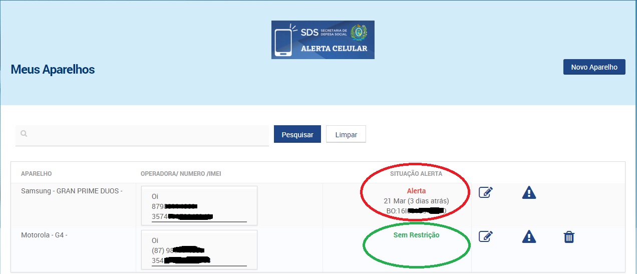 O cidadão poderá se cadastrar até mesmo sem ter seu aparelho roubado ou furtado, basta entrar neste link: https://servicos.sds.pe.gov.br/AlertaCelular/Aparelhos.jsf – e preencher a ficha cadastral e nela colocar o mais importante, o número do IMEI do celular. Caso for apenas cadastrar o aparelho para guardar o IMEI no sistema, não precisa colocar ALERTA, deixe SEM RESTRIÇÃO. “Conforme foto abaixo”