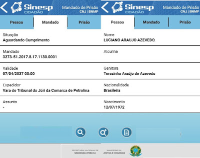 Foi feito uma abordagem, e após documentos consultados no aplicativo Sinesp Cidadão, foi constatado um mandado de prisão Nº 3273-51.2017.8.17.1130.0001 pela Vara do Tribunal do Júri da Comarca de Petrolina em desfavor de Luciano Araújo Azevedo, idade 44 anos.