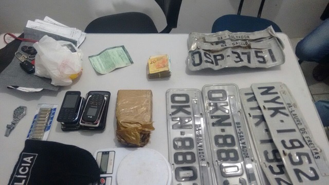 No interior da residência ainda foi encontrado 723 (setecentos e vinte três) gramas de CRACK, uma balança de precisão e 10 (dez) munições de calibre 38 e 05 (cinco) placas de veículos.