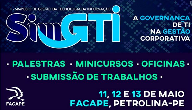 Com a temática “A governança de TI na gestão corporativa”, a Faculdade de Ciências Aplicadas e Sociais de Petrolina (Facape) promoverá nos dias 11, 12 e 13 de maio, o II Simpósio de Gestão da Tecnologia (SimGTI). O evento é organizado por estudantes e professores do curso de Gestão da Tecnologia da Informação (GTI) da Facape e contará com palestras, minicursos, oficina e apresentação de trabalhos. A participação no Simpósio é gratuita.