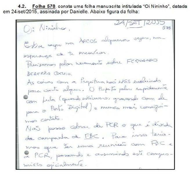 A Polícia Federal recolheu num dos endereços ligados a Antônio Carlos Vieira da Silva, apontado como um dos operadores da propina paga ao ex-presidente da Petrobras Aldemir Bendine, um documento com referência ao senador Fernando Bezerra Coelho, do PSB de Pernambuco. Num papel manuscrito datado de setembro de 2015, uma pessoa identificada como Danielle informa a “Nininho” que esteve na Arcos – agência de publicidade com endereço no Recife – e precisa conversar sobre “Fernando Bezerra Coelho”.