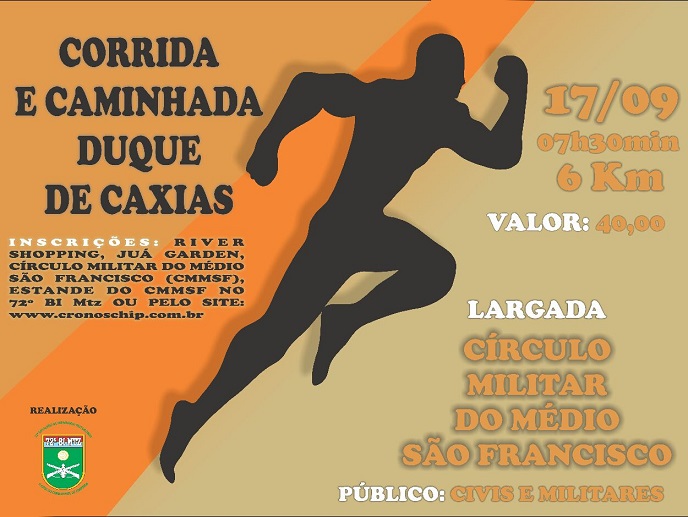 Já estão abertas as inscrições para a 1º Corrida e Caminha Duque de Caxias, promovida pelo Clube dos Subtenentes e Sargentos do Médio São Francisco (CSSMSF), e do Círculo Militar Médio São Francisco (CMMSF). O River Shopping é um dos parceiros e as inscrições podem ser feitas no quiosque montado em frente a Polishop, CMMSF e também pelo site www.cronoschip.com.br. A taxa de participação é de R$ 40.