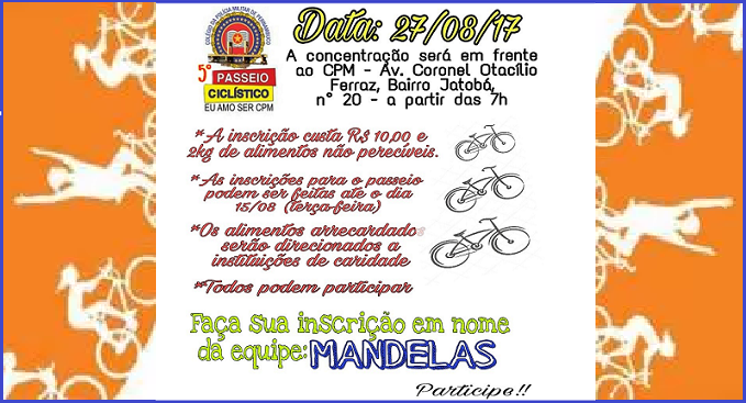 A equipe “Os Mandelas” convida a todos para o 5º Passeio Ciclístico do Colégio da PMPE de Petrolina.