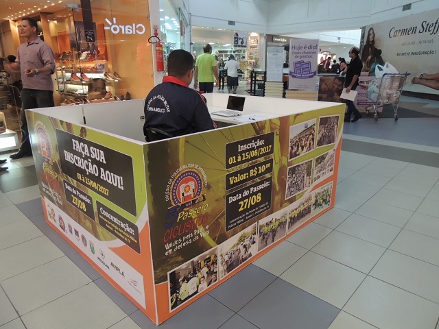River Shopping recebe quiosque para as inscrições do V Passeio Ciclístico do Colégio da PMPE – Petrolina. O espaço foi montado em frente à loja da Polishop, de hoje até o próximo dia 15. O Passeio Ciclístico, “Unidos pela Paz e em Defesa da Vida”, acontece no dia 27 de agosto (domingo) e terá concentração na frente do Colégio da Polícia Militar (Anexo I) – Petrolina, às 7h, na Estrada Das Pedrinhas. O valor da inscrição é de R$ 10, com direito a uma camisa em Dryfit.