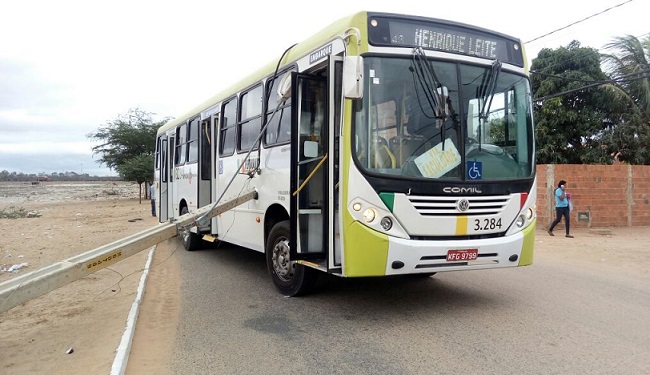 Nesta segunda-feira (18), por volta das 8h30, um caminhão que passava por uma rua do bairro Henrique leite, em Petrolina, acabou puxando os fios de um poste no exato momento em que estava passando um ônibus coletivo. O poste acabou caindo e atingindo o ônibus.