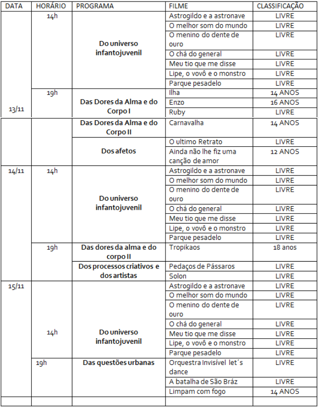 O programa está dividido em filmes infatojuvenis e adulto: “Do universo infantojuvenil”, “Das dores da alma e do corpo I e II”, “Dos afetos”, “Dos processos criativos e dos artistas” e “Das questões urbanas”. Todos os dias serão exibidas produções do Universo Infanto Juvenil: “Astrogildo e a astronave”, “O melhor som do mundo”, “O menino do dente de ouro”, “O chá do general”, “Meu tio que me disse”, “Lipe, o avô e o mostro” e “Parque pesadelo”.