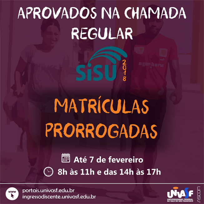 Os classificados na Chamada Regular do Sistema de Seleção Unificada (Sisu) 2018 terão até quarta-feira (7) para efetuar as matrículas nos cursos de graduação presenciais para os quais foram aprovados na Universidade Federal do Vale do São Francisco (Univasf). Os candidatos deverão observar atentamente o local de matrícula dos seus cursos e comparecer com a documentação exigida para o procedimento, como estabelece o Edital N° 1 do Processo Seletivo para Ingresso nos Cursos de Graduação (PS-ICG) 2018 da instituição.