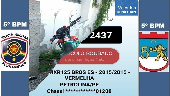Por volta das 03h30min deste domingo 01/04/2018, durante rondas próximo ao PSNC, C-1, zona rural de Petrolina-PE, Policiais Militares da RONDESC do 5º BPM visualizaram dois indivíduos numa motocicleta com registro de veículo roubado.