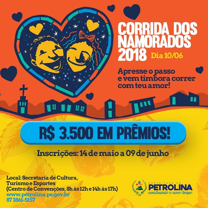 Os casais apaixonados já podem se inscrever na competição mais romântica e irreverente do São João de Petrolina. A ‘Corrida dos Namorados’, promovida pela prefeitura, está com prazo de inscrição aberto desta segunda (14) até o dia 9 de junho.