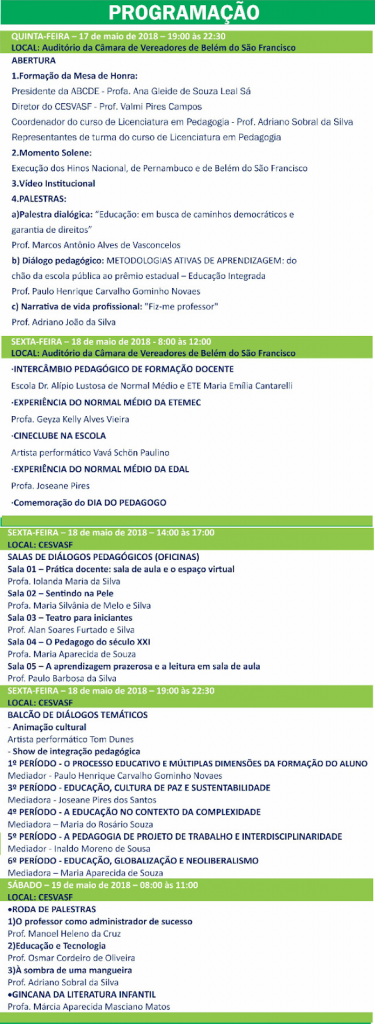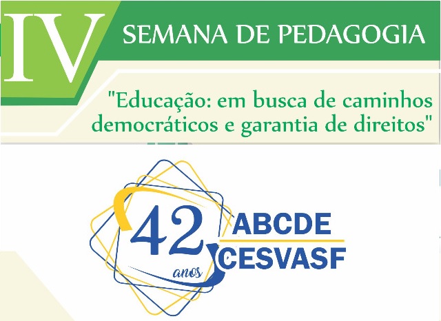ABCDE/CESVASF: PROGRAMAÇÃO DA IV SEMANA DE PEDAGOGIA – “Educação: em busca de caminhos democráticos e garantia de direitos” – de 17 a 19 de maio.