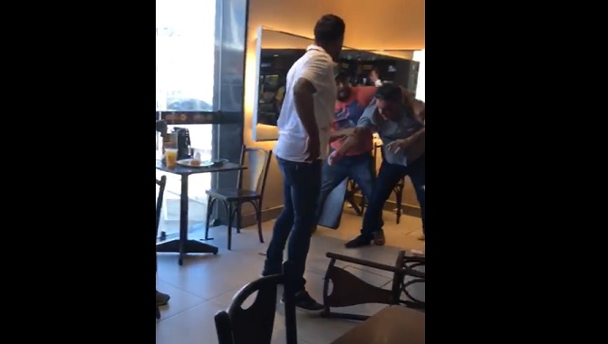 redes sociais e mostra o momento que dois homens começam a discutir, a trocar
