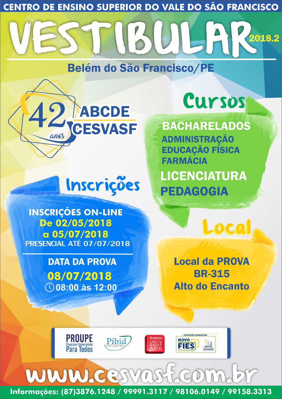 O CESVASF ESTÁ COM INSCRIÇÕES ABERTAS PARA O VESTIBULAR 2018.2.