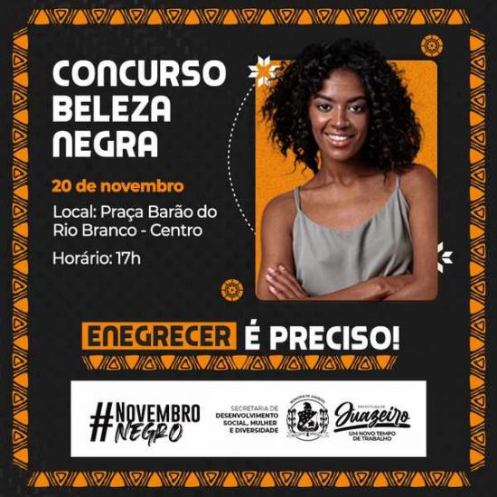 Acontece neste sábado (20), a partir das 17h, na Praça Barão do Rio Branco, no centro de Juazeiro, o concurso ‘Beleza Negra – ‘Preto (a), a beleza emana de você’. O evento, que integra a programação do Novembro Negro, é uma ação da Prefeitura de Juazeiro, através da Secretaria de Desenvolvimento Social, Mulher e Diversidade (Sedes), e visa escolher a mais bela negra e o mais belo negro de Juazeiro. Os vencedores nas categorias feminina e masculino irão representar Juazeiro no concurso Beleza Negra da Bahia.