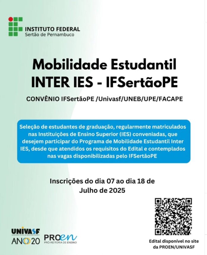 O Programa de Mobilidade Estudantil InterIES, uma parceria entre a Universidade Federal do Vale do São Francisco (Univasf), a Universidade do Estado da Bahia (Uneb), a Universidade de Pernambuco (UPE), a Faculdade de Petrolina (Facape) e o Instituto Federal do Sertão Pernambucano (IFSertãoPE), está com inscrições abertas para seleção de estudantes das IES conveniadas que desejam cursar disciplinas no IFSertãoPE no período letivo 2025.2. As inscrições estarão abertas no período de 7 a 18 de julho.
