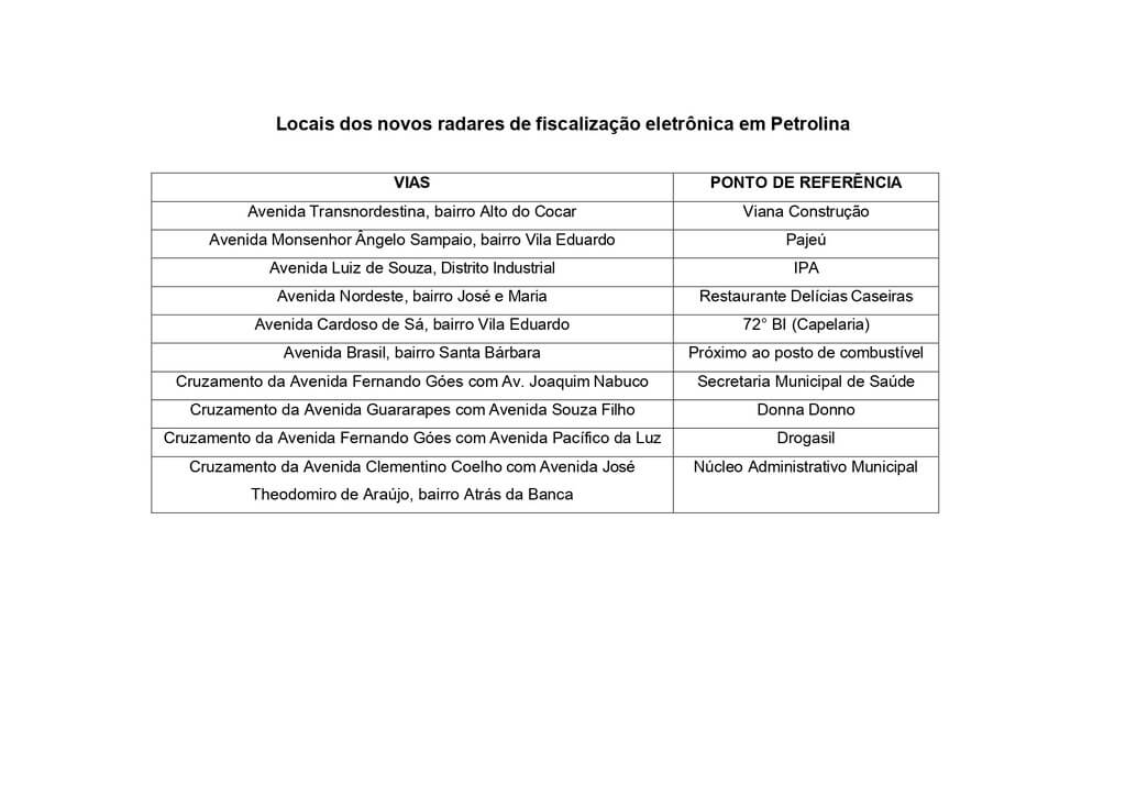 A Prefeitura de Petrolina, por meio da Autarquia Municipal de Mobilidade (AMMPLA), inicia na próxima segunda-feira (14) a operação de novos radares de fiscalização eletrônica. Os equipamentos foram instalados em locais com maior incidência de acidentes. A medida integra um conjunto de ações voltadas à melhoria da segurança viária no município.