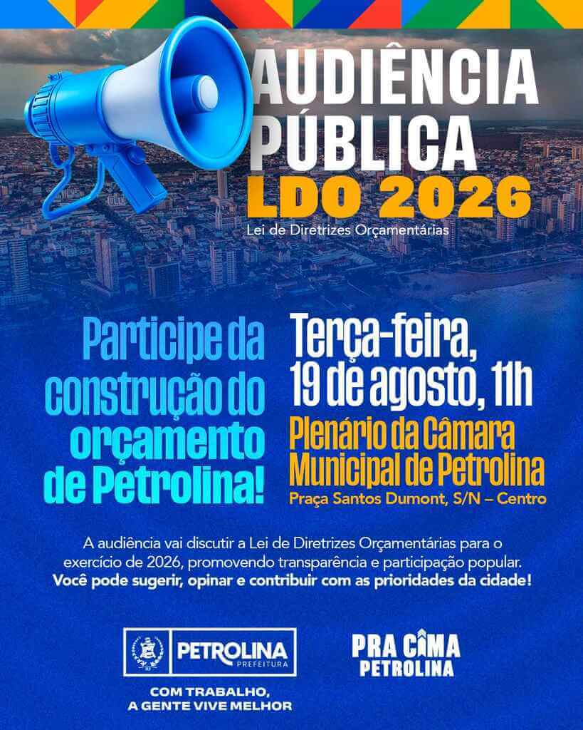 A Prefeitura de Petrolina, por meio da Secretaria de Planejamento, Gestão e Finanças, realizará, nessa terça-feira (19), às 11h, a audiência pública para apresentar e discutir a Lei de Diretrizes Orçamentárias (LDO) referente ao exercício de 2026.