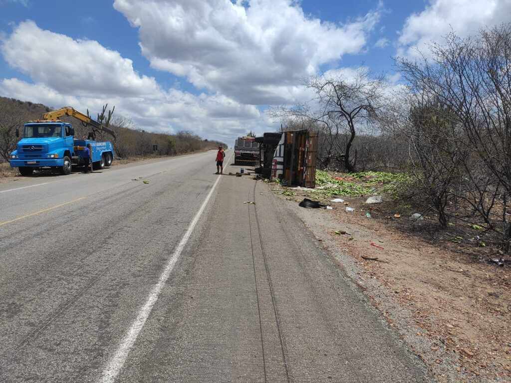 Um caminhão carregado de bananas tombou na madrugada deste sábado (13) na BR-428, no quilômetro 57, em um trecho conhecido como Bolas, entre os municípios de Orocó e Santa Maria da Boa Vista, no Sertão de Pernambuco.