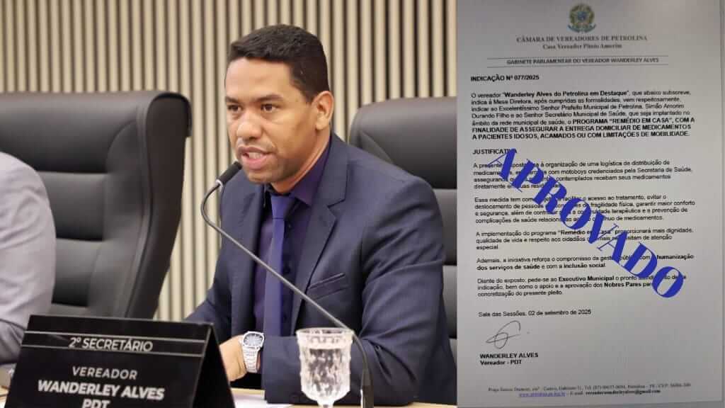 O vereador Wanderley Alves apresentou na Câmara Municipal de Petrolina a indicação para implantação do Programa “Remédio em Casa”, iniciativa que busca garantir mais comodidade e dignidade aos pacientes que enfrentam dificuldades de locomoção.