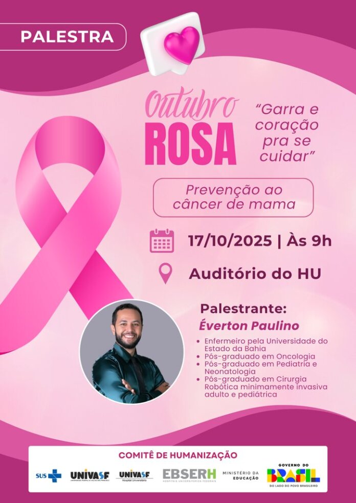 O Hospital Universitário da Universidade Federal do Vale do São Francisco (HU-Univasf), vinculado à Empresa Brasileira de Serviços Hospitalares (Ebserh), participa da campanha Outubro Rosa com ações voltadas à prevenção e ao diagnóstico precoce do câncer de mama e do câncer do colo do útero. No próximo dia 17, será realizada uma palestra para toda a comunidade hospitalar, no auditório da unidade, promovida pelo Comitê de Humanização.