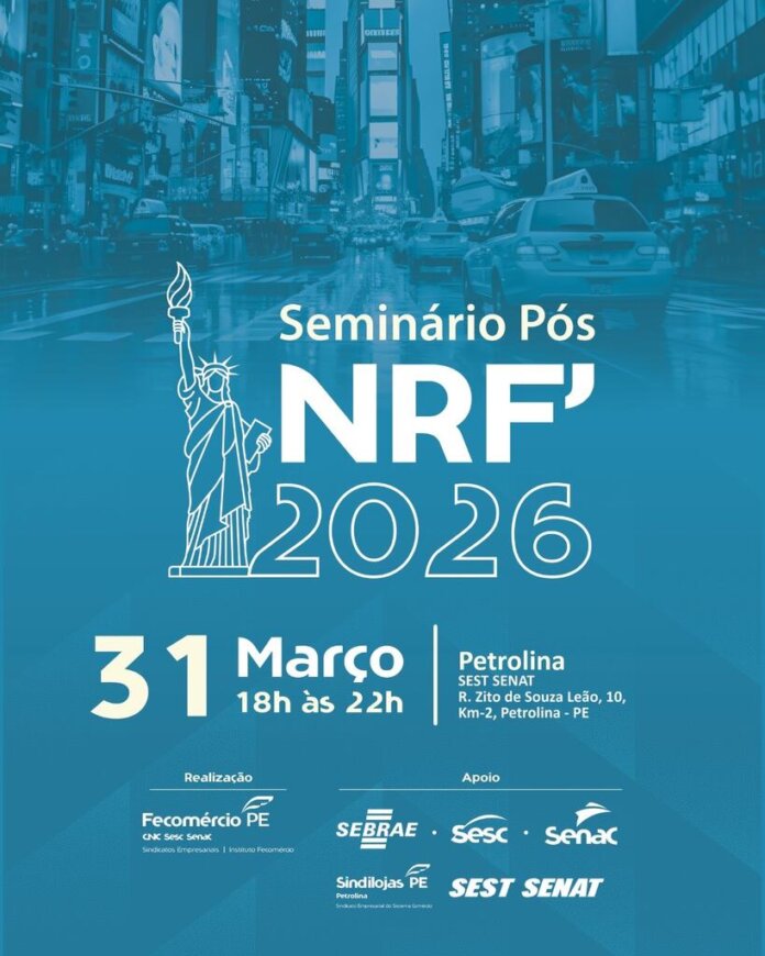 A Federação do Comércio de Bens, Serviços e Turismo do Estado de Pernambuco (Fecomércio-PE) promove, entre os dias 26 de março e 6 de abril, o “Seminário Pós NRF 2026”, em três cidades pernambucanas. A programação será realizada no Recife, no dia 26 de março, no Sebrae; em Petrolina, no dia 31 de março, no SEST SENAT; e em Garanhuns, no dia 6 de abril, no Centro Cultural Sesc. Os encontros acontecem das 18h às 22h e são promovidos em parceria com o Sebrae/PE, o Sesc-PE e o Senac-PE, além de contar com o apoio de entidades empresariais locais em cada município. A iniciativa é resultado da segunda missão técnica organizada pela Fecomércio-PE para a NRF, realizada, anualmente, em Nova York, nos Estados Unidos.