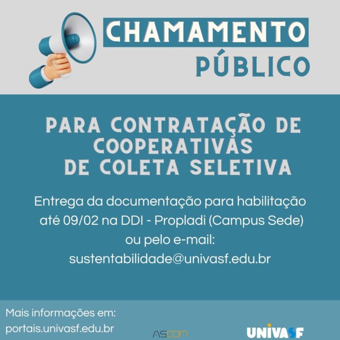 A Universidade Federal do Vale do São Francisco (Univasf), por meio da Comissão de Seleção da Coleta Seletiva Cidadã, designada pela Portaria Nº 89/2024, realiza processo seletivo para contratação de associações ou cooperativas de catadores de materiais recicláveis e reutilizáveis. O objetivo da seleção é firmar termo de compromisso para fins de coleta dos resíduos recicláveis ou reutilizáveis descartados nos campi Sede, Ciências Agrárias e Juazeiro. O prazo para entrega da documentação para habilitação no processo seletivo é até esta sexta-feira (9).