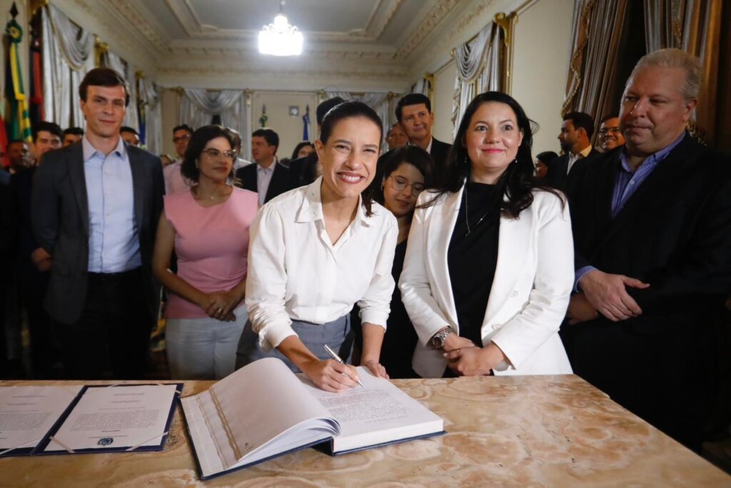 Na noite desta quinta-feira (26), a governadora Raquel Lyra assinou o termo de posse nomeando a nova secretária de Desenvolvimento Econômico (Sdec), Danielle Jar Souto. No evento, a chefe do Executivo Estadual também anunciou as novas presidências do Porto do Recife e do Laboratório Farmacêutico do Estado de Pernambuco (Lafepe), Wagner Augusto de Godoy Maciel e Thiago Ângelus Conceição Brandão, respectivamente. A vice-governadora Priscila Krause também participou da solenidade, que lotou o Salão das Bandeiras, no Palácio do Campo das Princesas, reunindo prefeitos, deputados, secretários e representantes da sociedade.