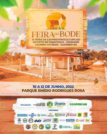 A Prefeitura de Juazeiro, através da Agência de Desenvolvimento Econômico, Agricultura e Pecuária (Adeap), divulgou a programação oficial da 9ª edição da Feira do Bode do distrito de Itamotinga, que acontecerá entre os dias 10 e 12 de junho, no Parque Emídio Rodrigues Rosa, no povoado de Cacimba do Silva.