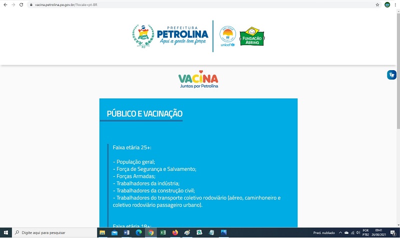 Com a chegada de novas doses da vacina contra a COVID-19, a Prefeitura de Petrolina abre agendamento da primeira dose para a população em geral com 25 anos ou mais, nesta quinta-feira (26). A partir das 14h, serão abertas cerca de 3 mil vagas na plataforma: vacina.petrolina.pe.gov.br.